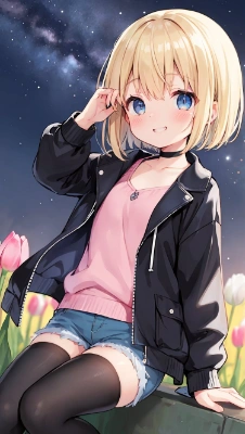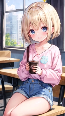masterpiece, best_quality, ultra_detailed, 8k_portrait, extremely_detailed_CG, 1_little_girl, bangs, collarbone, eyebrows_visible_through_hair, looking_at_viewer, blue_eyes, blonde_hair, bob_cut, okappa, short_hair, asymmetrical_bangs, hair_between_eyes, drooping_eyes, pink_shirts, blue_hot_pants, smile, grin, ridicule, ridicule, (narrow_eyes:1.4), despise, make_fun, outdoor, solo, denim, denim_shorts, midriff, navel, short_sleeves, dynamic_angle, <lora:add_detail:0.7>