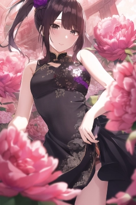 masterpiece, best quality, lie , china dress, peony, above knee, with blush cheeks, official art, {{ultra-detailed}}, {{high resolution}}, dynamic fuzziness, colorful, cowboy shot, , girl ,solo, 20 years old, beautiful detailed hair, beautiful detailed eyes, beautiful detailed hair, beautiful detailed eyes,