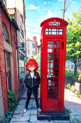 masterpiece, best quality, extremely detailed, anime, ((public telephone:1.3)) booth, telephone box, girl, ahoge, tracksuit, red hair, green eyes, chibi character, watercolor,,