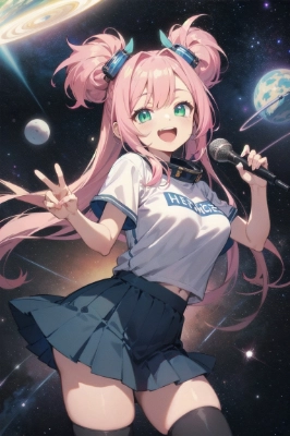 masterpiece, best quality, extremely detailed, anime <lora:flat2:1> <lora:hairdetailer:1> , the cosmos, astronauts, a pretty woman, longhair, ponytail, ahoge, garter belt, mini skirt, pink hair, green eyes, idol, goddess, princess, ojou-sama, colorful, science fiction, space, smile, happy, singing, jumping, smiling,