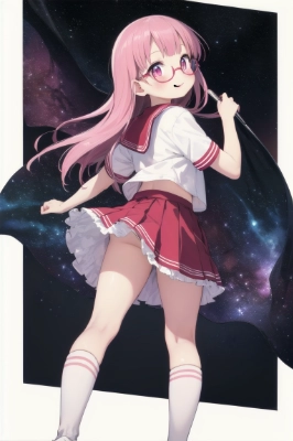 masterpiece, best quality, extremely detailed, anime, 1 girl, 14 years old, small breasts, thin body, small hip, thin thighs, pink long messy hair, (pink eyes), wearing red Wellington glasses, wearing sailor suit, short sleeve, (yellow sailor ribbon), white sailor breast cloth, (red sailor collar), (long red flared skirt), ((black leg wear)), white sneakers, very wide and dark starry sky, smiling, ((looking away)), from below, ((tilt head back)),
