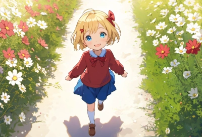 dowontown,city,(vending machine:1.2)(red Big iron box:1.35),loli,blond hair,short hair,hair bow,red bow,blue eyes,surprised look