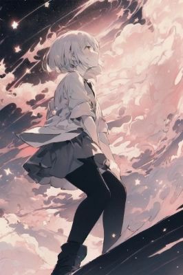((masterpiece, best quality, absurdres)), (pale colors:1.2), (black tights:1.2), slim body, (short bob:1.4), blue hair, (no inner color:1.4), (no underlayer:1.2), flat chest, dark yellow eyes, pink shorts, many flower, smile, top of head, starry sky, star lights, universe, space, look up, profile, <lora:asb-CH1:-1> <lora:asb-CH2:-1> ,,