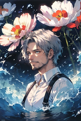 white background, white shirt, suspenders, around flower, (cosmos),