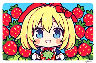 cafe,loli,blond hair,short hair,hair bow,red bow,blue eyes,light smile, (Strawberry Cake:1)