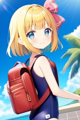 loli,blond hair,short hair,(hair bow,red bow:1.2),blue eyes,light smile, skirt lift by myself,Strawberry print cotton panties,jyojipan,from below <lora:jyojipan_ver2_NP:0.8>,indoors,devil_smile,
