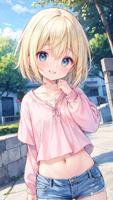 masterpiece, best_quality, ultra_detailed, 8k_portrait, extremely_detailed_CG, 1_little_girl, bangs, collarbone, eyebrows_visible_through_hair, looking_at_viewer, blue_eyes, blonde_hair, bob_cut, okappa, short_hair, asymmetrical_bangs, hair_between_eyes, drooping_eyes, pink_shirts, smile, grin, ridicule, ridicule, (narrow_eyes:1.4), despise, make_fun, indoor, shop, cafe, cafeteria, blurry, blurry_background, blurry_foreground, blush, photo_\(medium\), photo_background, dynamic_angle, short t-shirt, standing, night, curtain, strawberry_sponge_cake, strawberry_shortcake, midriff, navel, hot_pants, short_denim, holding_plate, strawberry_shortcake_is_served_on_a_plate, <lora:add_detail:0.7>