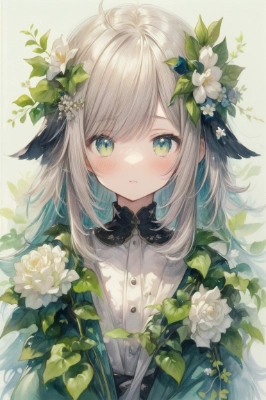 (colorful Gradation hair,exceptional, best aesthetic, new, newest, best quality, masterpiece, extremely detailed, anime, waifu:1.2), watercolor,wallpaper,multiple,flower,ivy,ornament,plants,fantasy,leaf,<lora:hairdetailer:1>,,