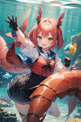 girl, anthropomorphic, shrimp, seafood, ocean, aquatic, crustacean, cute, adorable, sea-themed, underwater, scales, aquatic life, fins, marine, oceanic, shrimp tail, playful, cheerful, aquatic environment, unique character, marine fantasy, bright red hair, shrimp-colored clothing, ocean-inspired, lively, joyful, lobster tail gloves, crab claw gloves,