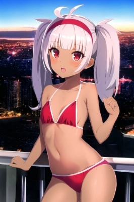 masterpiece, best quality, A little girl, red eyes, gray hair, blunt bangs, double ahoge, red hairband, dark skin, small breast, very big pigtails, red bikini, clear sky, in the city
