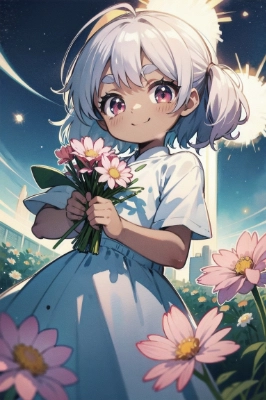Style:(solo:2.0),(watercolor:1.0),(thick outline:1.4),shota,cute,kawaii,lovely,pretty,dandy.Character:(dark brown skin:2.0),pink eyes,silver hair,(thick eyebrows,bushy eyebrows:1.4),pigtails,short hair,twintails,(9 years old:child,kid:1.4),big eyes,round eyes,droopy eyes,tareme.Outfit: Traditional police uniform with a navy blue shirt, black pants, and a bulletproof vest.Pose: Standing tall with arms crossed and a serious expression.Angle: Slightly tilted view from a low angle, highlighting the police officer\@!@s stature and authority.Facial Expression: Stern and focused.Location: Busy urban intersection with skyscrapers in the background.Items in the Scene: Police car, traffic lights, pedestrians, and buildings.Effect: Intense lighting with shadows to evoke a sense of duty and surveillance.,