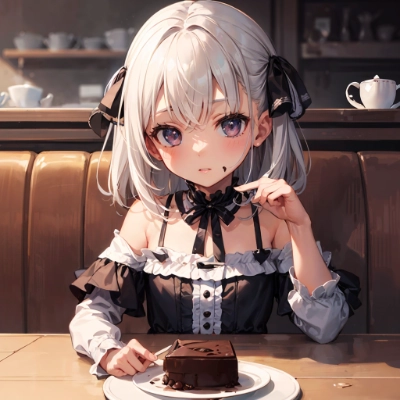 (chocolate cake:1.2),cafe,upper body,
