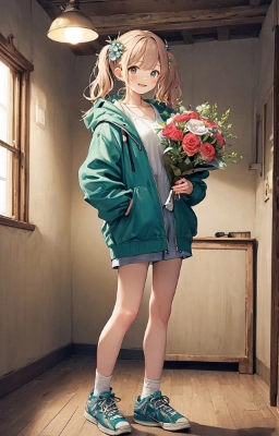masterpiece, best quality, extremely detailed, anime a woman in jeans shorts posing in a room with a window behind her breasts, 1girl, shorts, denim, ass, solo, smile, looking at viewer, denim shorts, bare shoulders, bangs, closed mouth, blonde hair, looking back, ponytail, indoors, sleeveless, sideboob, thighs, large breasts, blush, sidelocks, shiny, hair ornament, from behind, short shorts, cutoffs, bare arms,UHd,64k,perfect detail <lora:flat2:0.25> <lora:hairdetailer:1> ,