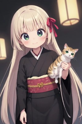 (((very longest hair))),black hair, smile, (((Long Hair))),straight Hair,hair ribbon,mintgreen stripe,Black Eyes,flat chest,straight Across bangs,princess Cut, Very Long Sideburn,roundry Head,Droping eyes,1 Girl,cute,Meekness,Bob Cut,long back hair,12 years Old,Kimono,japanese Cloth,Leaf of fig,lost paradise,