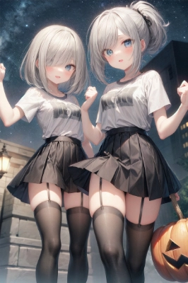 masterpiece, best quality, extremely detailed, anime,Visible nipples and areolas,, girl, a pretty woman, twintail, ponytail, T shirt, pink hair, silver hair, pink eyes, blue eyes, fairy, wizard, star, blushing, smile, holding hands,Hide one eye with one\'s hair,