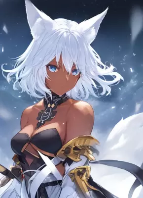 (((hyperrealistic))), (novel illustration),(solo), ((wind)), snow fall (muscular girl), (dark-skinned girl), detailed face,detailed eyes, short hair, white hair, (fox ears),(dress simple white Japanese),small chest, stright hand,