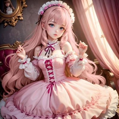 flower hair ornaments,{{turquoise dress}}, gray shadow dress,wide sleeves,floral print sleeves,Gothic lolita,white skirt,layered skirt,white sleeves,braided boots,thigh strap, girl, longhair, pink hair, odd eyes, fantasy, flower, happy,
