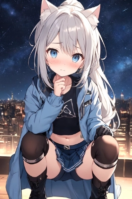 (Extraordinary, Best Beauty, New, Best Quality, Super Detailed 1.0, High Detailed, Detailed Background, Best Quality, High Detailed) Age: 16 years old, female, ponytail, dark blue hair, light blue eyes, ( ( Gray jacket) )), (navel exposed), (black T-shirt), navy belt skirt, navy socks, (absolute territory), thigh garter ring, black boots, black and blue headphones, (tilts head), ( Crouching), bowing slightly, (facial expression: blushing, shy), (flat chest), (starry sky in a futuristic city).,