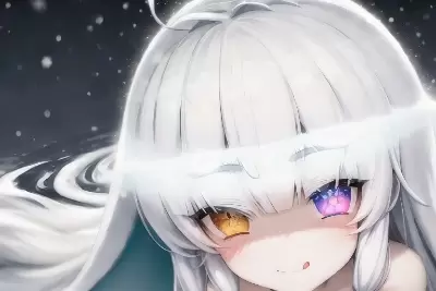 ((monster girl)),((Yuki-Onna)),((ghost girl)),ligne claire, whole body, from bellow,viewfinder,ceiling,looking at viewer, standing, paw pose,light blush, petite, girl,woman,female, baby,5 years old,very long hair, curly hair, bangs, eyes visible through hair, pale blue hair, two-tone hair, huge ahoge,seductive smile, stars in the eyes, tongue_out, tongue,😛,Delicate arms and hands, human hands, ((flat_chest)), blonde eyes, heterochromic,((white skin)),kimono, white Clothes,((🌨)),((snow scene)),absurdres, highres,HDR,bloom,light particles,Rembrandt lighting,film Reflection,