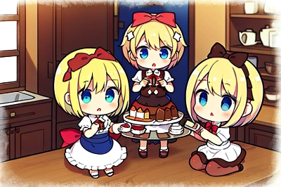 (cluster amaryllis:1.2),cluster amaryllis blooming in the meadow,loli,walking,blond hair,short hair,hair bow,red bow,blue eyes,from above,dutch angle,