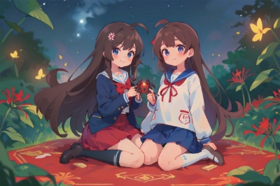 ((masterpiece, best quality, extremely detailed, anime, perfect anatomy)), (((Gateau chocolat, tea party, three tiers, gateau chocolat on a plate, afternoon tea, colorful sweets,))), two girls, girl A and B are 14 years old, (((girl A have that smirk face, half up half down hair, long hair, ahoge, dark brown hair and indigo eyes))), (((girl B have that Smile face, long hair, platinum blond hair and jade eyes))), ((girl A and girl B are same uniform)) , (((the uniform have that long sleeve, navy blue long pleat skirt, blue school blazer with white sailor collar, Gold school emblem on the right chest of the school blazer, white sailor collar with blue line on the edge, white shirt with red ribbon on the chest and leather boots of mid cut))), the uniform is conservative fashion, The girls are sitting on chairs, girls are facing each other across the table, <lora:saturation:1> <lora:yawanuri:0.8> ,