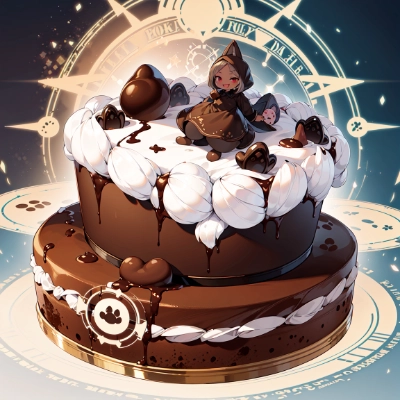 lot of (chibi:1.3) girls in (round anthropomorphic French chocolate cake costumes:1.5) are lined up, .
