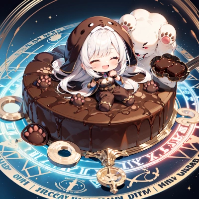 lot of (chibi:1.3) girls in (round anthropomorphic French chocolate cake costumes:1.5) are lined up, .