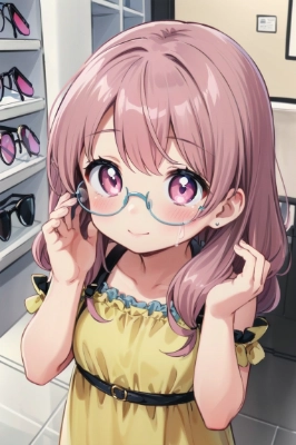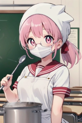 masterpiece, best quality, extremely detailed, anime, girl, 14 years old, small breasts, thin body, small hip, thin thighs, pink medium messy hair, big hair, (pink eyes), half_opened eyes, red Wellington glasses, sailor suit, short sleeve, (yellow sailor ribbon), white sailor breast cloth, (red sailor collar), smiling, upper body, look_up_to, head_tilt, wept bangs, hair fluttering in the wind, from above, open mouth, paw pose,,