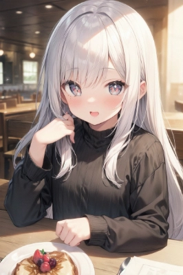 masterpiece, detailed face, ultra detailed, best quality, (illustration:1.2), 8k cg wallpaper, stunning art, beautiful hair, (hand with five fingers:0.6), a cute girl, 10yo, small body, (silver long hair:1.1), gosthic girly onepiece dress, sittig across the table with a big pudding on it, (touch the cheeks:1.5), (happy smile:1.1), be impressed, blush, :o, pupils sparkling, in the restaurant, ,