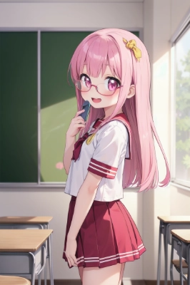 masterpiece, best quality, extremely detailed, anime, upper_body, focus on eyes, 1 girl, 14 years old, (pink hair), short upper ponytail, bright pupils, pink eyes, red sailor color, white sailor breast cloth, yellow sailor ribbon, short sleeve, classroom, from front, looking straight at viewer, upper_body, red Wellington eyeglass, smiling, white face mask, white coverall apron, (wearing white triangle cloth covering over head), wearing white simple head hood, white stew in stockpot , tall stockpot, big stockpot, handle of ladle, girl behind stockpot,