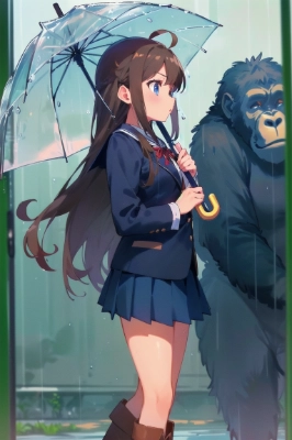 ((masterpiece, best quality, extremely detailed, anime, perfect anatomy, beautiful structure, conservative fashion)), a girl is 14 years old, a gorilla is in the zoo cage, (((her stare at a gorilla in a zoo cage, the gorilla also stare at the girl out of zoo cage, zoo background in rainy day, She have an umbrella,))) anxiety, melancholy, ((the girl have that long hair, ahoge, dark brown hair and indigo eyes, she wear the uniform that long sleeve, navy blue long pleat skirt, blue school blazer with white sailor collar, gold school emblem on the right chest of the school blazer, white sailor collar with blue line on the edge and white shirt with red ribbon on the chest, she wear brown leather boots of mid cut)) , ((profile shot, long shot, looking away)) <lora:saturation:1> <lora:yawanuri:0.75> ,