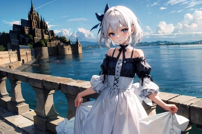 very cute loli,blond hair,shiny hair,short twintails,bangs,blue eyes,hair ribbon,flat chest,pinafore dress,happy