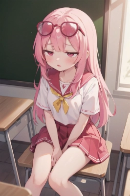 masterpiece, best quality, extremely detailed, anime, girl, 14 years old, child, small breasts, thin body, small hip, thin thighs, pink hair, long hair, (messy hair), (pink eyes), wearing red Wellington glasses, wearing sailor suit, short sleeve, (yellow sailor ribbon), white sailor breast cloth, (red sailor collar), (wearing red long flared skirt), classroom, laughing, standing, from side, looking straight at viewer, hold (1 mobile phone) in right hand, show front display of mobile phone, hand_up, upper_body, clear eyes,