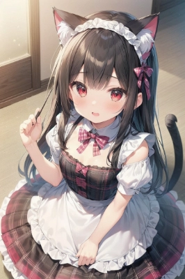 1girl, ((masterpiece)), ((best quality)), (ultra-detailed), ((kawaii)), (lovely),game cg,16years old,(dropy dog ear:1.5),black eyes,pink hair,bobcut,japanes kimono clothes:1.3,maid dress:1.3,cotton pantie:1.3,knee socks,Frilled headband,smile,fullbody,arms up,jumping:1.3,garden,,