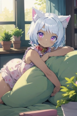 Style:(solo:2.0),(thick outline:1.4),shota,cute,kawaii,lovely,pretty,dandy.Character:pink eyes,((dark skin)),silver hair,(thick eyebrows,bushy eyebrows:1.4),pigtails,short hair,twintails,(9 years old:child,kid:1.4),big eyes,round eyes,droopy eyes,tareme.Title: custard pudding.Outfit: Pastel-colored dress.Pose: Sitting on a plush cloud.Composition: Centered with a slight tilt of the head.Facial expression: Joyful smile.Location: A whimsical garden.Objects in the location: Flowerbeds, butterflies, and a tea set.Looking at: A plate of perfectly wobbly custard pudding.Effect: Soft sunlight filtering through the trees.,
