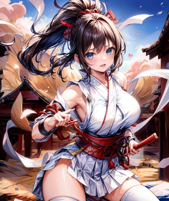 (realistic), (masterpiece), (best quality:1.1), (ultra high res:1.2),(RAW photo:1.2), (sharp focus:1.3), (face focus:1.2), (Samurai Residences in Japan night background:1.2),best quality, masterpiece,1female,20yo,large breast, small eyes,BREAK,fighting stance,blue eyes,brown hair,yellow dress,short kimono, white thighhighs, white skirt,(kunoichi:1.5), <lora:add_detail:1.5>