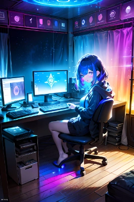 Bedroom, gaming desk, computer monitor, keyboard, gaming PC, scatter