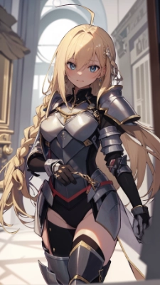 (masterpiece:1.1), (best quality:1.1), (high quality:1.1), (absurdres:1.4), (highres:1.4), cowboy shot, (official art:1.2), (unreal engine:1.2), BREAK (looking at another:1.4), (in the castle:1.4), gothic architecture, indoors BREAK (confidence:1.2), (rivalry:1.4), , (inscrutable:1.2), wearing a sword, (grin:1.2), crossed arms, crossed legs, closed mouth, BREAK (2girls:1.2), knight girl, shiny hair, hair ornament, very long hair, (blonde hair:1.2), (single braid:1.6), ahoge, thighhighs, hair between eyes, bangs, BREAK paradis military uniform, (full armor:1.4), gallant, gentle, sweetheart,