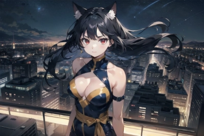 masterpiece, best quality, extremely detailed, anime,1woman, solo, 25yo, mature, medium breasts,BREAK,blue bodysuit, cleavage, yellow sash,BREAK,beautiful detailed face and eyes, smug, black hair, long hair, side parted, flipped hair, (floating hair:1.2), cat ear, red eyes,BREAK,(standing on roof of building:1.2), Tokyo, (night:1.2),