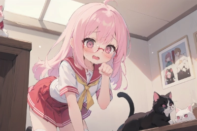 masterpiece, best quality, extremely detailed, anime, girl, 14 years old, child, small breasts, thin body, small hip, thin thighs, pink hair, (messy long hair), (pink eyes), wearing sailor suit, short sleeve, (yellow sailor ribbon), white sailor breast cloth, (red sailor collar), (wearing red long flared skirt), classroom, straight face, sitting on school chair, from above, looking away, hands on school desk, upper_body, clear eyes, parted_lips, jitome, put red Wellington eyeglass on head, half-closed_eyes <lora:boldline:-1> <lora:agomaru:-1> ,
