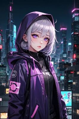 punk style, kawaii punk, Silver-haired purple-eyed girl, wearing a hood, looking at viewer, night, blue neon light, upper body, cyberpunk illustration, vivid, rooftop, night, rooftop, background with skyscrapers, cityscape --ar 3:2, cyber city