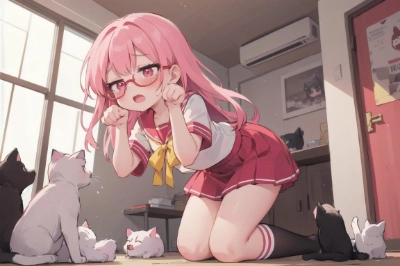 masterpiece, best quality, extremely detailed, anime, 1 girl, 14 years old, child, small breasts, thin body, small hip, thin thighs, pink hair, (messy long hair), wept bangs, (pink eyes), wearing sailor suit, short sleeve, (yellow sailor ribbon), white sailor breast cloth, (red sailor collar), (wearing red long flared skirt), (black socks), room, low table, (((3+ cats))), blush , kneeling, leaning forward, hands up, (paw pose), laughing, open mouth, drooling, red Wellington eyeglasses, from below, looking away <lora:agomaru:-1> <lora:boldline:-1> <lora:grgr-eye1:0.5> ,