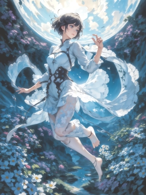 absurdres, highres, (extremely detailed fine touch:1.3), (hard light, studio light, light rays, dappled light, reflection, shadows, ray tracing:1.0), ///, kawaii girl, white short hair, backlight, flower, zentangle, art nouveau, full body, jumping, (horizon:1.3), sky, cloud, rich round moon