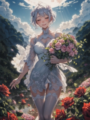 absurdres, highres, (extremely detailed fine touch:1.3), (hard light, studio light, light rays, dappled light, reflection, shadows, ray tracing:1.0), ///, kawaii girl, white short hair, backlight, flower, zentangle, art nouveau, full body, jumping, (horizon:1.3), sky, cloud, rich round moon