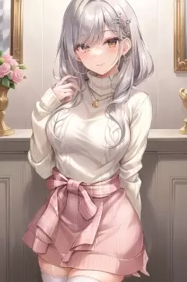 ((masterpiece)),(best quality),(1 girl),cute,young,(light silver wayvy hair),(Soft pink lip color, subtle eye makeup with a touch of shimmer, and curled lashes),(ultra-detailed A cozy oversized knit sweater paired with a plaid midi skirt in a warm red and green color palette. Complete the look with a pair of knee-high socks and ankle boots),model pose,smile,Marble wall, metallic sculptures, suspended flower arrangements, spotlights,(from front)