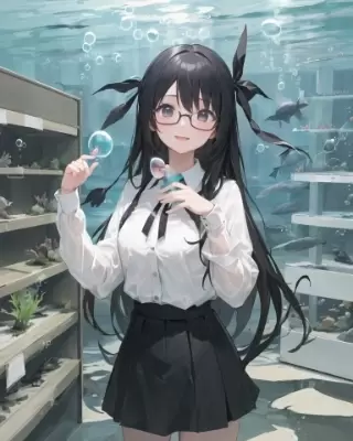 masterpiece, best quality, 1girl, eye focus, bishoujo, (large aquarium:1.6),(library:1.4), (many bookshelves:1.1),(lots of fish:1.0)wearing glasses, semi-long straight hair, black hair, white shirt, black ribbon, black skirt, smile,(detailed many beautiful vivid flowers:1.1), soft focus, intense shadows, (rim lighting:1.0), golden hour lighting, (many detailed fine particles:1.0) (many colorful emission lines:1.0)