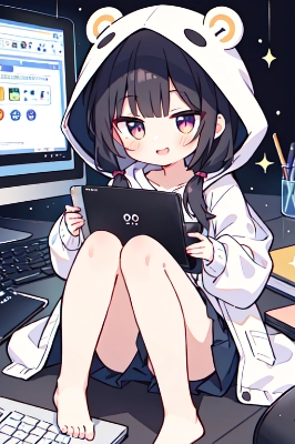 (hacker, computer, laptop pc, streamer:1.2), dark room, long hair, oversize parka, hooded, bottmless, (roomwear:0.8), barefoot, knees up,