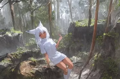 melting trees, (masterpiece:1.2), (best quality:1.2), (solo:1.3), brave female, (dark-skinned)++ female, (simple white turtleneck t-shirt:1.2), white dress, frills, fox ears, (white hair), sharp red eyes, small chest, (dark deep forest:1.2), trees, rocks,
