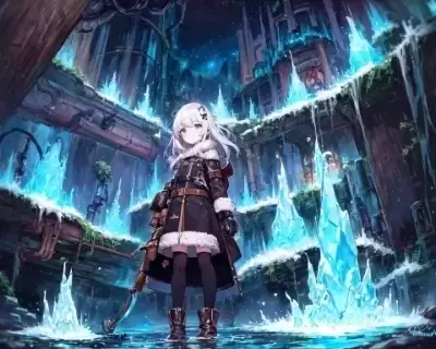 mini base, masterpiece, (kawaii), (flat color:1.3), (RGB Splitting:1.3), 80s, anime screencap, (brown_outline:1.1), (1girl:1.3), solo, chibi, lo-fi hiphop, chillhop, fantasy, point color, (tyndall effect:1.3), tyndall scattering,white hair, long hair, purple_eyes, short boots, leather belt, backpack,cowboy_shot, adventurer, reading, badmood,intricate background, winter, snowflakes, nixie tube, hollow, (blue cave:1.1), crystal clear water, water ripples, stream, stepping stones, (rusty stairs:1.1), (mechanized palace:1.1), frozen pipe, rusted metal, industrial pipe, limestone, moss, stalactites, stalagmites, underground, crystal, rock formations, mineral deposits, subterranean, serene, digital signage, light particles, depth of field,