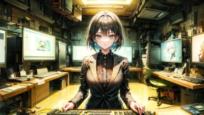 ((neon lights,neon trim, future, dystopia:1.2)),(detailed eyes,beautiful eyes, black eyes:1),(1girl, solo:1.2),(fair skin,shiny skin:1.01),(short hair,black and green hair:1.01),(black shirt,black suit,earrings:1.2),(blunt ends,bangs, symbolic pupil:1.05),(lips:0.7),((large breasts, covered nipples, curvy:0.8)),((PC,amount of monitor,keyboard:1)),personal computer,((ALL MIND)),